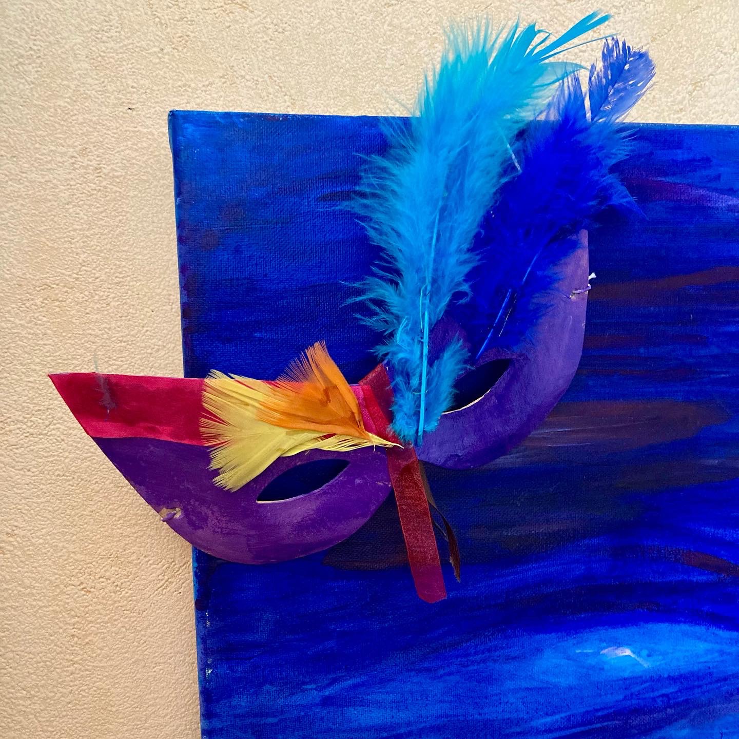 Peinture, collage rubans et plumes colorées.